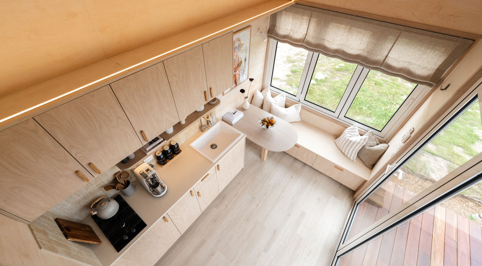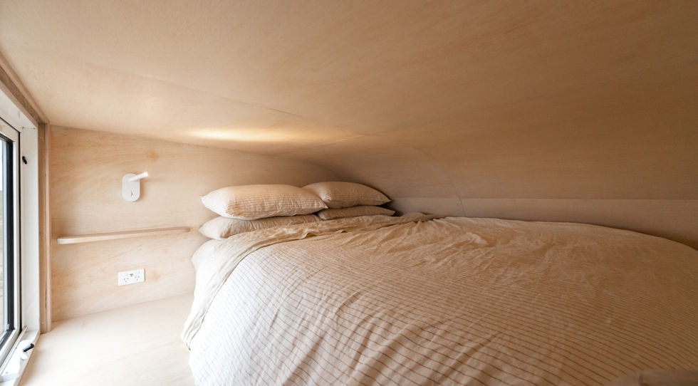 Inside, Scandinavian-inspired interiors are layered with light timber and soft neutrals. A queen bed sits in the loft, with a bunk below — a simple, practical layout within a compact footprint.